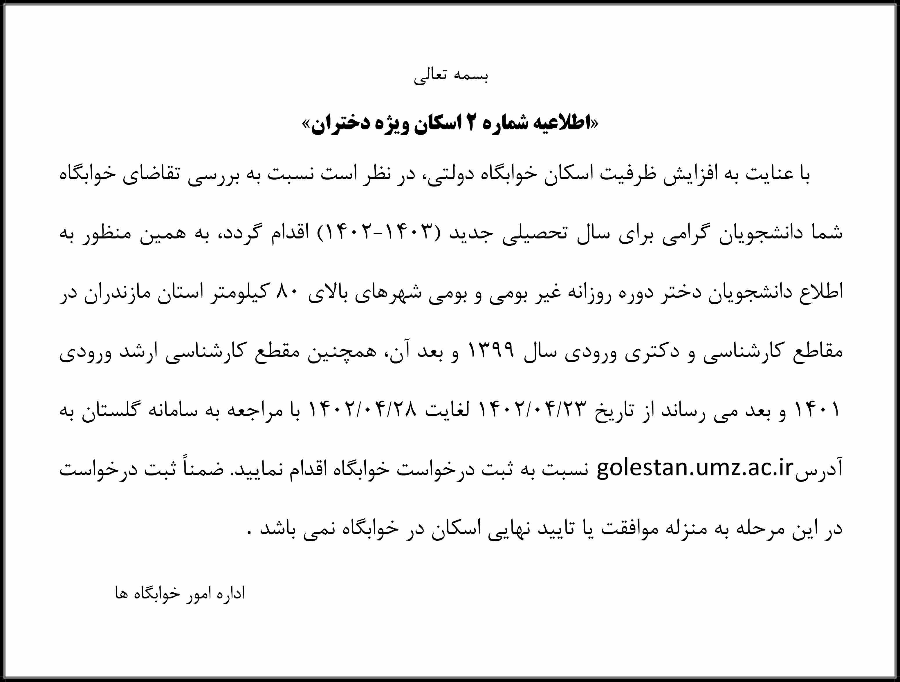 اطلاعیه شماره 2 اسکان ویژه دختران - دانشگاه مازندران